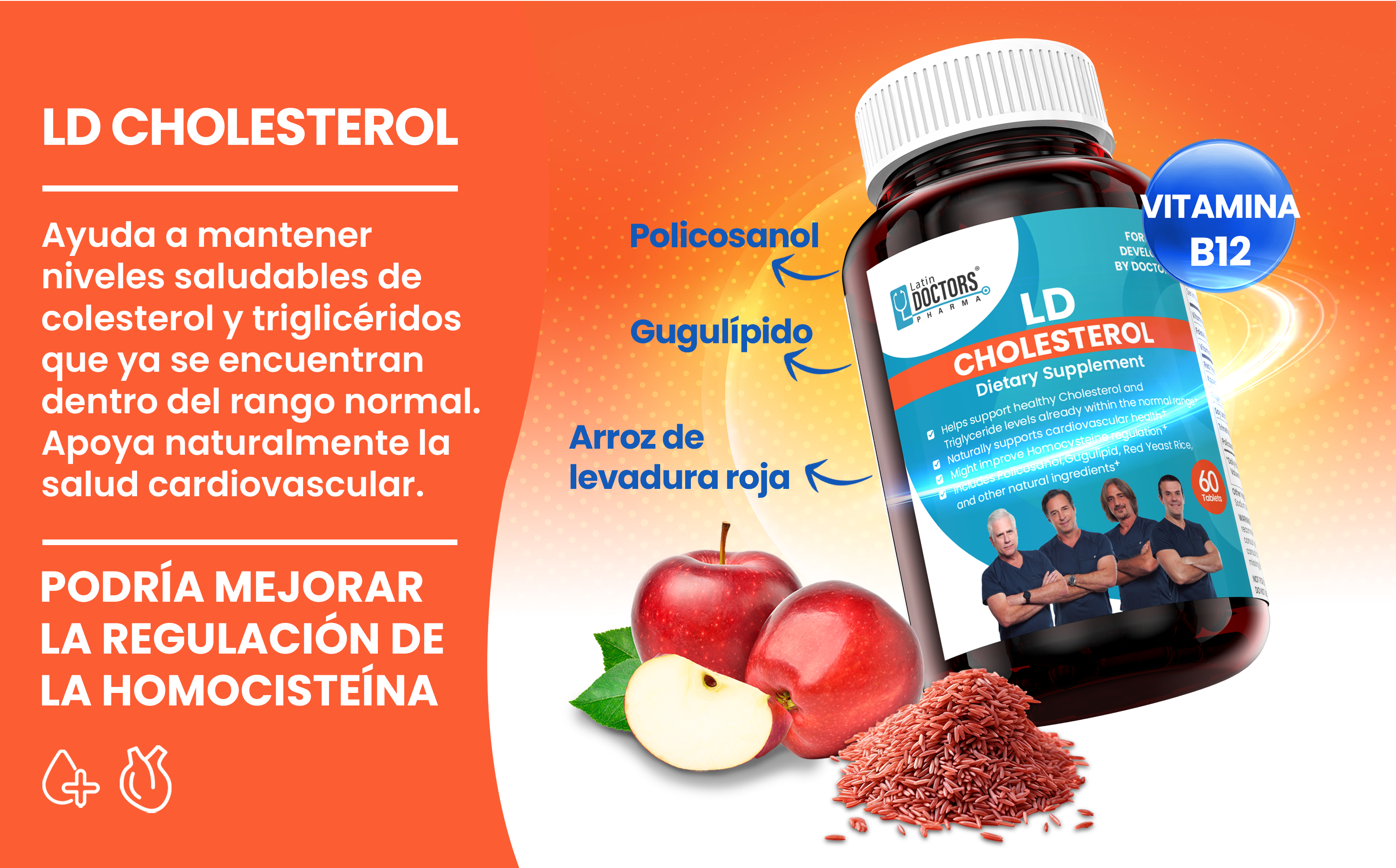 El colesterol en niveles normales es una sustancia esencial para el cuerpo y tiene funciones naturales importantes, incluyendo la formación de enzimas digestivas, la producción de hormonas y la generación de vitamina D. En pacientes donde las concentraciones en la sangre son demasiado altas, aumenta el riesgo de enfermedades cardiovasculares, incluyendo ataques cardíacos y accidentes cerebrovasculares. En Latin Doctors Pharma hemos desarrollado cuidadosamente una mezcla equilibrada de ingredientes naturales para promover un metabolismo saludable de colesterol y triglicéridos, incluyendo la regulación de la homocisteína.