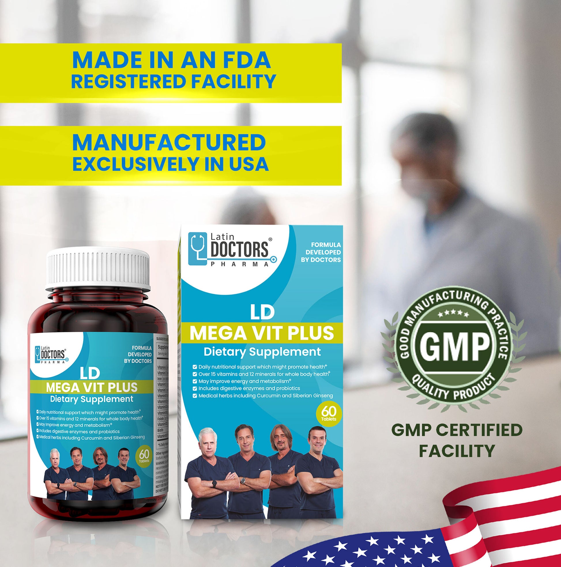 Cada día, tu cuerpo produce piel, músculos, huesos y realiza restauración y múltiples funciones complejas para sostener la vida. Las vitaminas y minerales son nutrientes esenciales necesarios para la mayoría de las funciones corporales. La mayoría de las vitaminas y minerales deben provenir de los alimentos o suplementos, ya que el cuerpo humano no produce suficiente cantidad de ellos o no los produce en absoluto. En Latin Doctors Pharma hemos formulado una combinación de alta potencia de vitaminas esenciales, minerales, aminoácidos, probióticos, cofactores y múltiples ingredientes naturales que actúan en armonía para desempeñar cientos de roles importantes en nuestro cuerpo.