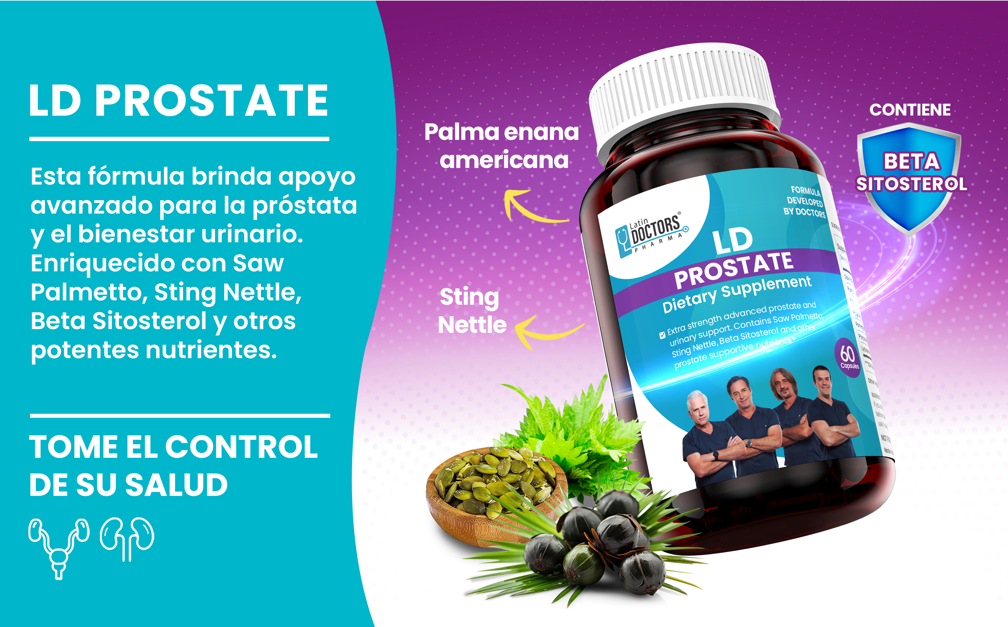 - Contiene Saw Palmetto, Hoja de Ortiga, Beta Sitosterol y otros nutrientes que apoyan la próstata.*