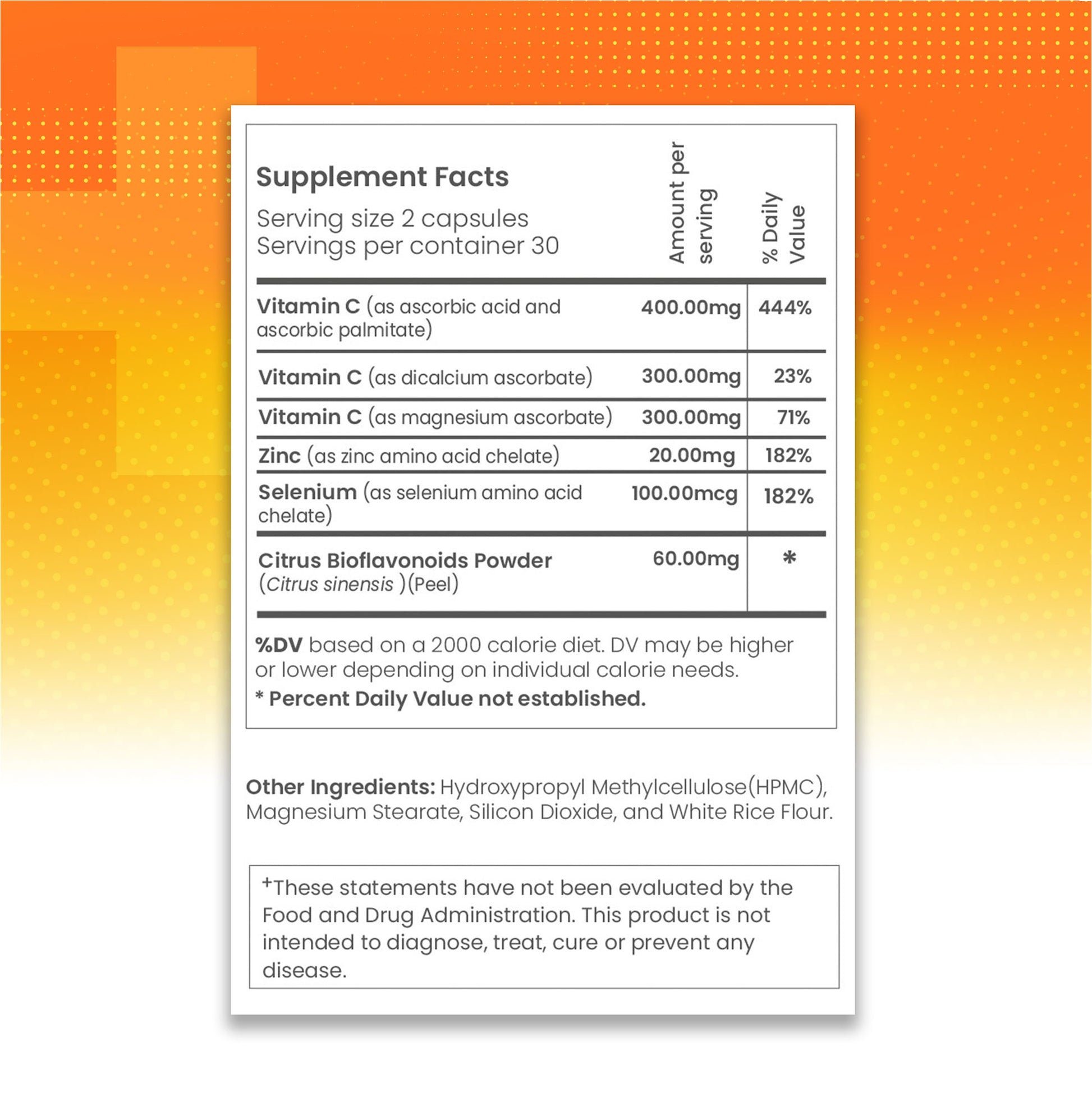 - Vitamina C (como ácido ascórbico y ascorbil palmitato): 400.00 mg (444% del Valor Diario)